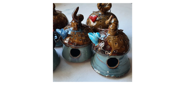 The textured pottery I make today has evolved over a lifetime of working in the arts.  I have played with many materials and media and seem to always come back to clay. I have earned a bachelors degree from the University of Oshkosh, Wisconsin and a masters degree from University of New Mexico, Albuquerque.  I have taught K-12 art for 14 years and have led numerous workshops on art and culture incorporating arts into the classroom curriculum.  My whimsical teapots have gained national recognition.  After spending 27 years in Arizona and New Mexico, I returned to Wisconsin to reinvent my life as a studio potter. I sell my art at juried art shows in the Midwest. Visitors are welcome to visit my studio by appointment please.